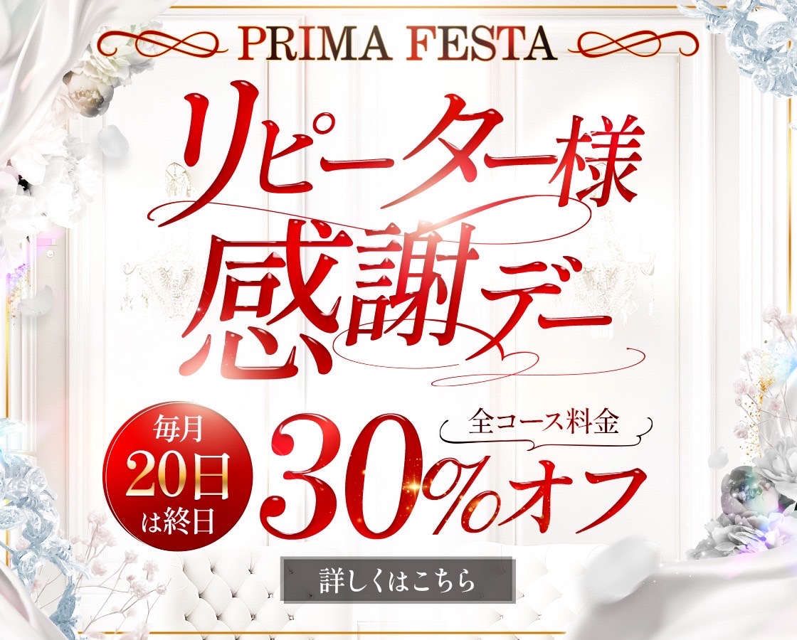 2025.01.16(木) NEWセラピスト割のご案内 2025.01.15(水) PRIMA FESTA 毎月20日は30%OFF!! 2025.01.09(木) 各種クレジット決済のお知らせ 2024.11.01(金) 遠方のご予約も大歓迎です🌟 2023.04.27(木) 全国セラピスト募集中*・ 2023.04.25(火) 広島 PRIMA DONNA 始動! 全て見る本日の出勤TODAY’S SCHEDULE